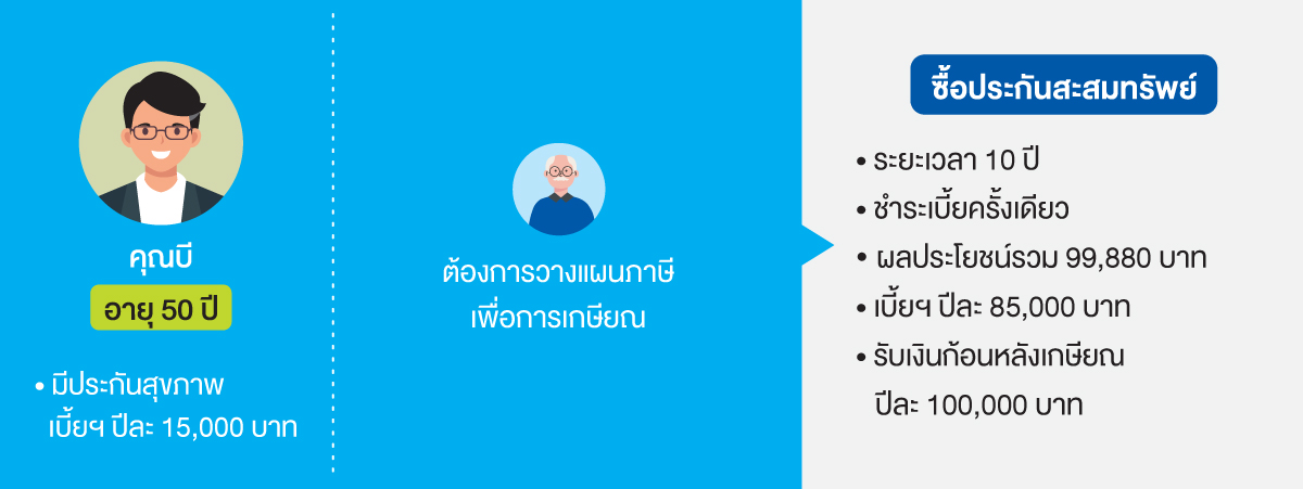 การทำประกันชีวิตเพื่อใช้สิทธิลดหย่อนภาษีให้สอดคล้องกับเป้าหมายการเงินของเรา ทำได้ง่ายๆ เพียงแค่เราหาเป้าหมายการเงินระยะยาวของเราให้ได้ หลายคนมีเพียงเป้าหมายเดียว แต่บางคนมีหลายเป้าหมายก็ได้ การวางแผนเพื่อการเกษียณเป็นเป้าหมายสำคัญเป้าหมายหนึ่งเพราะการที่คนมีอายุยืนยาวขึ้น จำเป็นต้องใช้เงินช่วงเกษียณมากขึ้น หากปัจจุบันเรามีอายุ 35 ปี การวางแผนเพื่อการเกษียณจะมีระยะเวลาประมาณ 25 ปี เราสามารถเลือกแบบประกันสะสมทรัพย์เพื่อเสริมแผนการเกษียณของเราและได้ประโยชน์จากการลดหย่อนในหมวดประกัน ตัวอย่างเช่น คุณ บี ปัจจุบัน อายุ 50 ปี มีประกันสุขภาพในปัจจุบันเบี้ยฯ ปีละ 15,000 บาท สามารถวางแผนภาษีเพื่อการเกษียณเพิ่มเติมโดยใช้ประกันสะสมทรัพย์ ระยะเวลา 10 ปี ชำระเบี้ยฯ ครั้งเดียว ผลประโยชน์รวม 99,880 บาท เบี้ยฯ ปีละ 85,000 บาท เพื่อรับเงินก้อนหลังเกษียณปีละ 100,000 บาท
