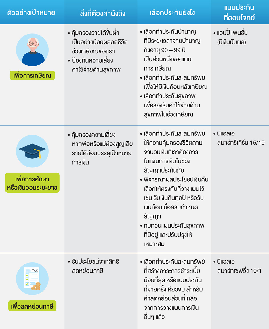 รูปแบบเป้าหมายที่สามารถนำมาประกอบการวางแผนภาษี สิ่งที่ต้องคำนึงถึง และรูปแบบของประกันชีวิตที่ตอบเป้าหมายต่างๆ อาจจะสรุปได้คร่าวๆ ตามตาราง ดังนี้
