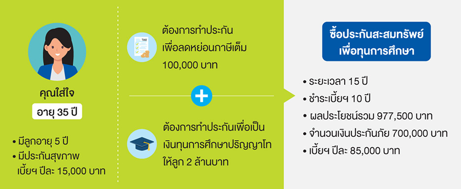 เป้าหมายการเงินอีกเป้าหมายหนึ่งคือเป้าหมายการศึกษาของลูก เราสามารถวางแผนครอบครัวเพื่อเตรียมพร้อมสำหรับการศึกษาของลูกในระยะยาว หากลูกกำลังศึกษาอยู่ในชั้นอนุบาล แผนการศึกษาของลูกจะมีระยะเวลา 12 ปีโดยประมาณสำหรับระดับปริญญาตรี และ 16 ปี สำหรับระดับปริญญาโท การเลือกทำประกันสะสมทรัพย์เพื่อลดหย่อนภาษีจึงไม่จำเป็นต้องเป็นแบบประกันที่มีระยะเวลาคุ้มครอง 10 ปี แต่อาจเลือกทำประกันในหลายรูปแบบเพื่อให้เหมาะสมกับเป้าหมายของเรา ตัวอย่างเช่น คุณใส่ใจ ปัจจุบันอายุ 35 ปี มีลูกอายุ 5 ปี ต้องการเลือกทำประกันเพื่อใช้สิทธิลดหย่อนภาษีเต็ม 100,000 บาท ประกันสุขภาพที่มีอยู่ในปัจจุบันเบี้ยฯ ปีละ 15,000 บาท ต้องการใช้ประกันเพื่อเป็นเงินทุนการศึกษาปริญญาโทให้ลูก 2 ล้านบาท แบบประกันเพื่อใช้สิทธิฯ ภาษีของคุณใส่ใจจะต่างกับของคุณบี โดยแผนภาษีจากประกันสะสมทรัพย์ ระยะเวลา 10 ปี ชำระเบี้ยครั้งเดียว แม้จะใช้สิทธิภาษีได้เท่ากัน แต่ไม่สามารถตอบเป้าหมายเพื่อการศึกษาของลูกได้ การวางแผนการศึกษาให้ลูกจะมีภาระชำระเบี้ยเพิ่มขึ้นและไม่สามารถนำมาใช้สิทธิลดหย่อนภาษีได้ คุณใส่ใจจึงควรเลือกแบบประกันสะสมทรัพย์เพื่อทุนการศึกษาปริญญาโท ระยะเวลาคุ้มครอง 15 ปี ระยะเวลาชำระเบี้ยฯ 10 ปี ผลประโยชน์รวมตลอดสัญญา 977,500 บาท จำนวนเงินประกันภัย 700,000 บาท เบี้ยฯ ปีละ 85,000 บาท แทน