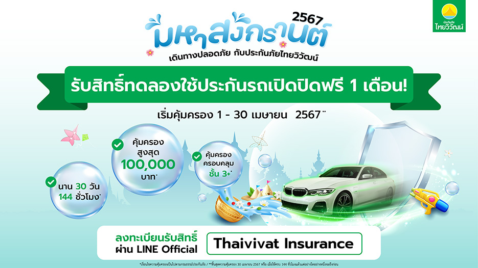 บริษัท ประกันภัยไทยวิวัฒน์ จำกัด (มหาชน) ผู้นำด้านนวัตกรรมประกันภัยอันดับ 1 ของไทย พร้อมมุ่งพัฒนาผลิตภัณฑ์และบริการ เพื่อยกระดับคุณภาพชีวิตคนไทย รวมถึงส่งเสริมให้คนไทยมีหลักประกันที่มั่นคง ตามวิสัยทัศน์ “คิดเผื่อเพื่อทุกชีวิต” นำโดยนายเทพพันธ์ อัศวะธนกุล รองกรรมการผู้อำนวยการ เปิดเผยว่า ตามมติ ครม.เห็นชอบให้ดำเนินโครงการ “เย็นทั่วหล้า มหาสงกรานต์ 2567” เพื่อกระตุ้นให้เกิดการเดินทางท่องเที่ยวในช่วงเทศกาลสงกรานต์ ทั้งชาวไทยและชาวต่างชาติ และเพื่อเป็นการประชาสัมพันธ์งานสงกรานต์ให้เป็นที่รู้จักในระดับสากล รวมถึงผลักดันให้ ติด 1 ใน 10 ประเทศสุดยอดเฟสติวัลของโลกนั้น คาดการณ์ว่าแต่ละจังหวัดทั่วไทยจะมีการจัดกิจกรรมอย่างเต็มรูปแบบ และจะมีประชาชนจำนวนมากเดินทางกลับภูมิลำเนา เพื่อร่วมกิจกรรมตามประเพณีกับครอบครัวและเดินทางท่องเที่ยวตามสถานที่ต่างๆ ในโอกาสนี้ บมจ.ประกันภัยไทยวิวัฒน์ ขอส่งมอบความห่วงใยให้กับคนไทยที่ยังไม่มีประกันภัยรถยนต์ภาคสมัครใจ ให้เดินทางด้วยความอุ่นใจช่วงเทศกาล ด้วยการมอบทดลองใช้ฟรี! “ประกันรถเปิดปิด” ประเภท 3+ ทุนประกัน 100,000 บาท นาน 1 เดือน หรือ (144 ชั่วโมง / 30 วัน ) เพื่อให้คนไทยคลายความกังวลและมีความสุขตลอดการเดินทางช่วงเทศกาลสงกรานต์ โดยสามารถรับสิทธิ์ได้ง่ายๆ ผ่าน LINE Official Account “Thaivivat Insurance” หรือ ID LINE : @Thaivivat หรือดูรายละเอียดเงื่อนไขเพิ่มเติมผ่านเว็บไซต์ www.thaivivat.co.th เริ่มลงทะเบียนได้ ตั้งแต่วันที่ 1- 25 มีนาคม 2567 จากนั้นรอรับข้อความยืนยันผ่าน SMS และสามารถดาวน์โหลดกรมธรรม์ผ่านแอปพลิเคชัน Thaivivat