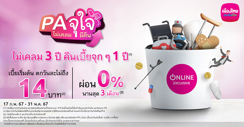 พิเศษสำหรับผู้ที่ซื้อประกันอุบัติเหตุ “PA จุใจ ไม่เคลมมีคืน” บนช่องทาง Online Sale และ MTL Click โดยชำระเบี้ยประกันภัยรายปี เบี้ยประกันภัยขั้นต่ำ 5,000 บาท (เฉพาะการชำระเบี้ยประกันภัยต่อกรมธรรม์ในปีแรกเท่านั้นและสำหรับการซื้อแบบประกันใหม่เท่านั้น) รับโปรโมชันผ่อนชำระ 0% นาน 3 เดือน เมื่อชำระผ่านบัตรเครดิตธนาคารกสิกรไทย ธนาคารกรุงศรีอยุธยา ธนาคารยูโอบี ธนาคารซิตี้แบงก์ ธนาคารไทยพาณิชย์ และธนาคารกรุงไทย ระยะเวลาโปรโมชันตั้งแต่ 17 กุมภาพันธ์ 2567 – 31 พฤษภาคม 2567(6)