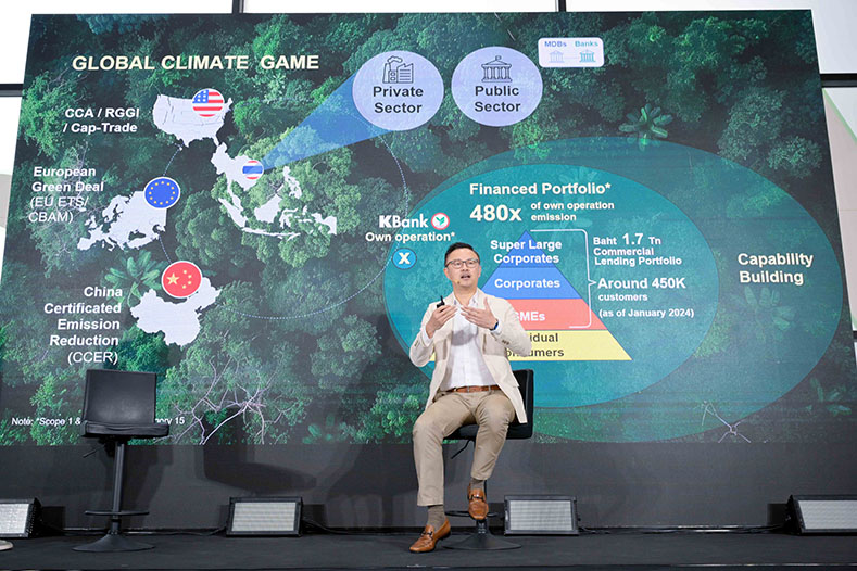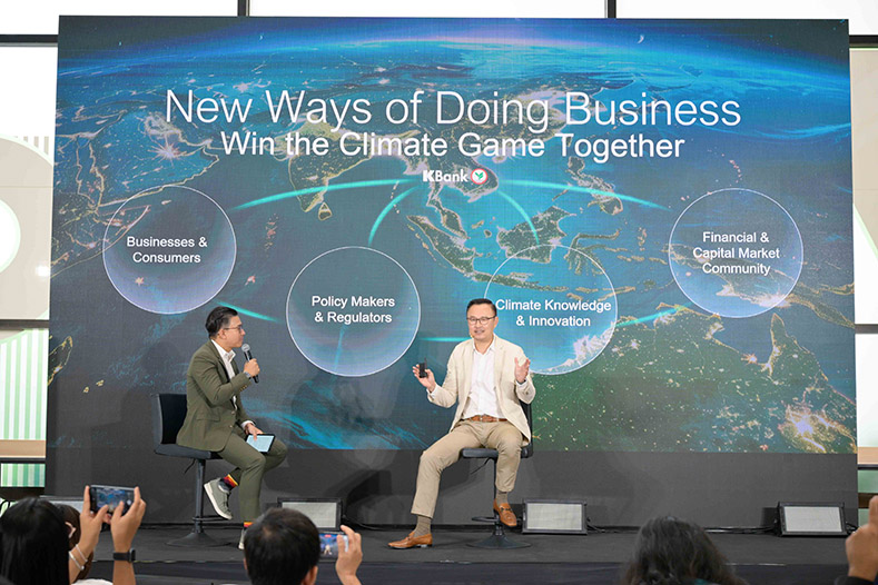 ธนาคารกสิกรไทยเปิดยุทธศาสตร์ด้านสิ่งแวดล้อม ปี 2567 ที่จะพาธุรกิจไทยก้าวสู่โลกธุรกิจรูปแบบใหม่ พร้อมรับมือยุค Climate Game ที่มูลค่าของธุรกิจไม่ได้ขึ้นอยู่เพียงผลกำไรจากธุรกิจดังเดิมแต่มีปัจจัยด้านสิ่งแวดล้อมและสังคมเข้ามาเกี่ยวข้อง โดยธนาคารเดินหน้าการทำงานสู่เป้าหมายการปล่อยก๊าซเรือนกระจกสุทธิเป็นศูนย์ ทั้งปรับการดำเนินงานของธนาคาร (Green Operation) ด้วยมาตรฐานสากล การส่งมอบสินเชื่อและเงินลงทุนด้านความยั่งยืน (Sustainable Financing and Investment) ที่จะไปสู่ยอด 100,000 ล้านบาท ในปี 2567 นี้ รวมทั้งศึกษาและจัดเตรียมโซลูชันด้านสิ่งแวดล้อมในทุกมิติที่ภาคธุรกิจต้องการ (Climate Solutions) ทั้งด้านการให้คำปรึกษา การจัดทำ Carbon Accounting การทำธุรกิจเกี่ยวเนื่องกับคาร์บอนเครดิตและระบบนิเวศที่เกี่ยวข้อง (Carbon Ecosystem) เพื่อสนับสนุนภาคธุรกิจในการเปลี่ยนผ่านพร้อมรับมือกับแรงกดดันด้านกฎระเบียบสิ่งแวดล้อมของโลกและไทยที่เพิ่มขึ้น และตอบรับกับโอกาสทางธุรกิจที่จะเกิดขึ้น มุ่งสู่เศรษฐกิจการปล่อยก๊าซเรือนกระจกสุทธิเป็นศูนย์ไปด้วยกัน