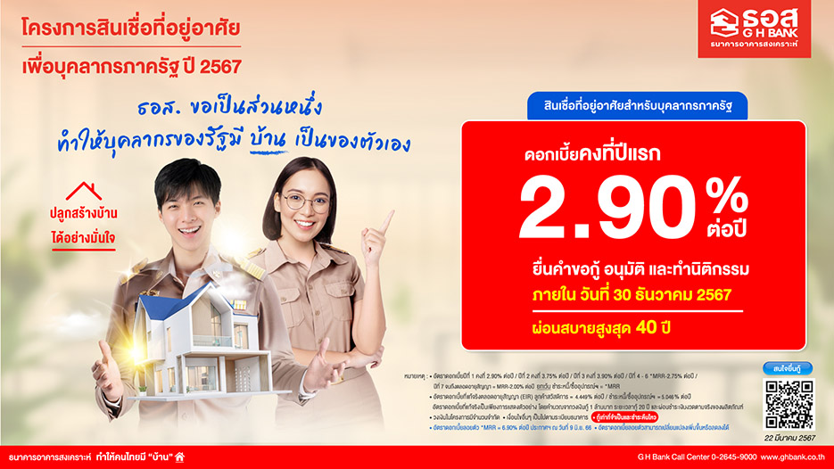 2. โครงการสินเชื่อที่อยู่อาศัยเพื่อบุคลากรภาครัฐ ปี 2567 กรอบวงเงิน 20,000 ล้านบาท สำหรับข้าราชการ พนักงานราชการ พนักงานมหาวิทยาลัย พนักงานรัฐวิสาหกิจ พนักงาน/เจ้าหน้าที่ของรัฐ และลูกจ้างประจำ กู้เพื่อซื้อ ปลูกสร้าง ต่อเติม ซ่อมแซม ไถ่ถอนจากสถาบันการเงินอื่น (รีไฟแนนซ์) ชำระหนี้เกี่ยวกับที่อยู่อาศัย และเพื่อซื้ออุปกรณ์หรือสิ่งอำนวยความสะดวกที่เกี่ยวเนื่องเพื่อประโยชน์ในการอยู่อาศัย คิดอัตราดอกเบี้ย ปีที่ 1 เท่ากับ 2.90% ต่อปี ปีที่ 2 เท่ากับ 3.75% ต่อปี ปีที่ 3 เท่ากับ 3.90% ต่อปี เฉลี่ย 3 ปีแรก เท่ากับ 3.52% ปีที่ 4-6 เท่ากับ MRR-2.75% ต่อปี (4.15% ต่อปี) ปีที่ 7 จนถึงตลอดอายุสัญญา เท่ากับ MRR-2.00% ต่อปี กรณีซื้ออุปกรณ์ฯ/ชำระหนี้ เท่ากับ MRR โดยข้อมูล ณ วันที่ 20 มีนาคม 2567 มีลูกค้ายื่นขอสินเชื่อรวม 215 บัญชี คิดเป็นวงเงินยื่นขอสินเชื่อ 195 ล้านบาท ทำนิติกรรมแล้ว 89 บัญชี คิดเป็นวงเงินนิติกรรม 82.7 ล้านบาท