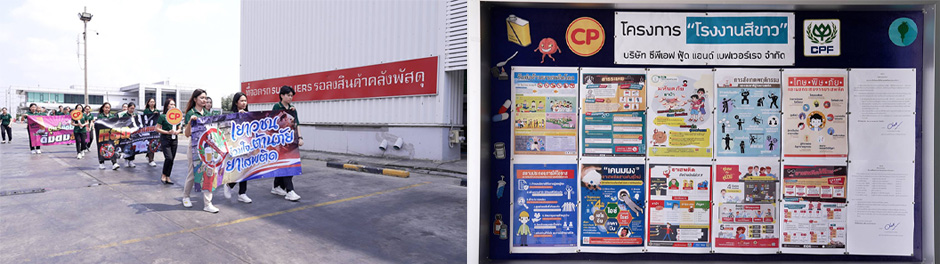 ซีพีเอฟ ให้ความร่วมมือกับทุกภาคส่วนขับเคลื่อนองค์กรปลอดยาเสพติดและเป็นโรงงานสีขาว ตามโครงการ “ซีพีเอฟ องค์กรสีขาว เพื่อย่างก้าวที่ยั่งยืน” โดยให้ความร่วมมือกับทุกภาคส่วนในการป้องกันและแก้ไขปัญหายาเสพติด ปฏิบัติตามแนวทางปฏิบัติที่ดี เคารพหลักสิทธิมนุษยชน ตั้งแต่การให้ความรู้ความเข้าใจให้พนักงานมีความตระหนักและร่วมกันขับเคลื่อนนโยบายด้านยาเสพติดอย่างจริงจัง การอบรมพัฒนาศักยภาพผู้ปฏิบัติงานด้านยาเสพติดเป็นเครือข่ายที่สำคัญในการเป็นเกราะป้องกันไม่ให้พนักงานมีความเสี่ยงไปยุ่งเกี่ยวกับยาเสพติด รวมทั้งมีนโยบายช่วยเหลือพนักงานในการบำบัดรักษาและฟื้นฟู และให้โอกาสพนักงานที่รักษาหายสามารถกลับมาทำงานกับองค์กรได้ เพื่อสนับสนุนให้สถานประกอบกิจการทุกแห่งของซีพีเอฟปลอดจากยาเสพติด เป็นสมาชิกที่ดีและอยู่ร่วมกันในสังคมอย่างมีความสุข มั่นคงและยั่งยืน