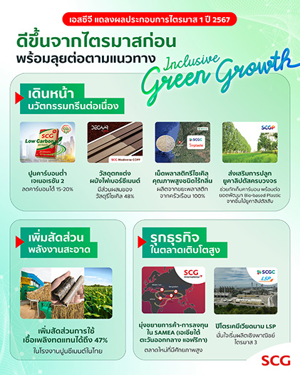 เอสซีจี แถลงผลประกอบการ ไตรมาส 1 ปี 2567 ดีขึ้นจากไตรมาสก่อน เดินหน้านวัตกรรมกรีนต่อเนื่อง เพิ่มสัดส่วนพลังงานสะอาด รุกธุรกิจในตลาดเติบโตสูง