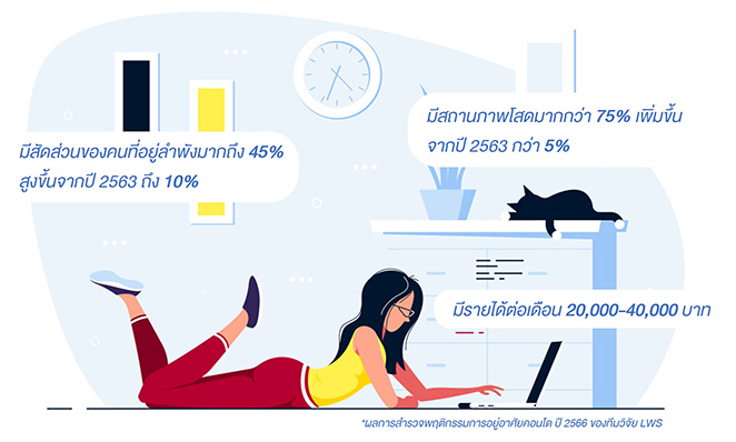 ในขณะที่ผลสำรวจของ แอล. ดับเบิลยู. เอส.ฯ เมื่อเดือนพฤษภาคม ปี 2566 จากจำนวนผู้อยู่อาศัยใน โครงการอาคารชุดในพื้นที่กรุงเทพฯ-ปริมณฑล 729 ตัวอย่าง พบว่า มีสัดส่วนของคนที่อยู่เพียงลำพัง คิดเป็นสัดส่วน 45% สูงขึ้นจากปี 2563 ถึง 10% และมีสถานภาพโสดมากกว่า 75% เพิ่มขึ้นจากปี 2563 ประมาณ 5% โดยมีรายได้ต่อเดือนอยู่ในช่วง 20,000-40,000 บาท