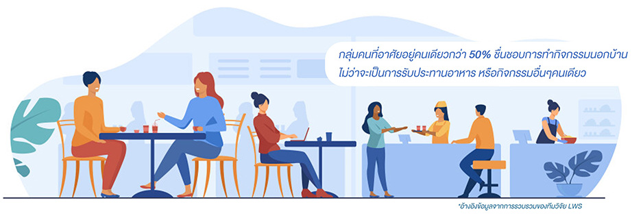จากการผลสำรวจเป็นที่ยืนยันได้ว่า กลุ่มคนที่อาศัยอยู่คนเดียวกว่า 50% ชื่นชอบการทำกิจกรรมนอกบ้าน ไม่ว่าจะเป็นการรับประทานอาหาร หรือกิจกรรมอื่นๆคนเดียว ถ้าจะกล่าวว่าธุรกิจร้านอาหารสำหรับรับประทานคนเดียวเติบโตอย่างต่อเนื่อง คงไม่แปลกเพราะกำลังเป็นเทรนด์ที่ได้ผลตอบรับตามกระแสนิยมในปัจจุบัน