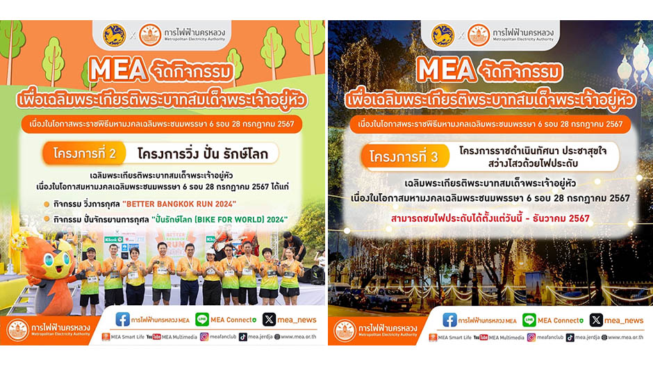 MEA หรือการไฟฟ้านครหลวง ในฐานะหน่วยงานรัฐวิสาหกิจสังกัดกระทรวงมหาดไทย จัดกิจกรรมร่วมเฉลิมพระเกียรติพระบาทสมเด็จพระเจ้าอยู่หัว เนื่องในโอกาสพระราชพิธีมหามงคลเฉลิมพระชนมพรรษา 6 รอบ 28 กรกฎาคม 2567 โดยมีรายละเอียด ดังนี้
