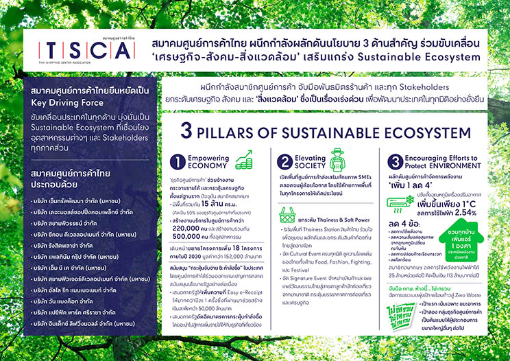 สมาคมศูนย์การค้าไทย (Thai Shopping Centre Association) หรือ TSCA ผลักดันนโยบาย 3 ด้านสำคัญครอบคลุม ‘เศรษฐกิจ-สิ่งแวดล้อม-สังคม’ ในการเสริมความแข็งแกร่ง Sustainable Ecosystem ผ่านการชู ‘ธุรกิจศูนย์การค้า’ เป็น Key Driving Force กระตุ้นเศรษฐกิจและขับเคลื่อนประเทศชาติให้ก้าวไปข้างหน้าอย่างแข็งแกร่ง พร้อมโชว์ศักยภาพความแข็งแกร่งการผนึกกำลังของสมาชิกสมาคมจากธุรกิจศูนย์การค้าชั้นนำของเมืองไทยทั้งหมด 12 บริษัท เพื่อเชื่อมต่อ Stakeholders และพันธมิตรร้านค้าในการร่วมยกระดับมาตรฐานสังคมและประเทศ โดยเฉพาะด้าน ‘สิ่งแวดล้อม’ เพื่อเสริมการเติบโตของประเทศในทุกมิติอย่างยั่งยืน