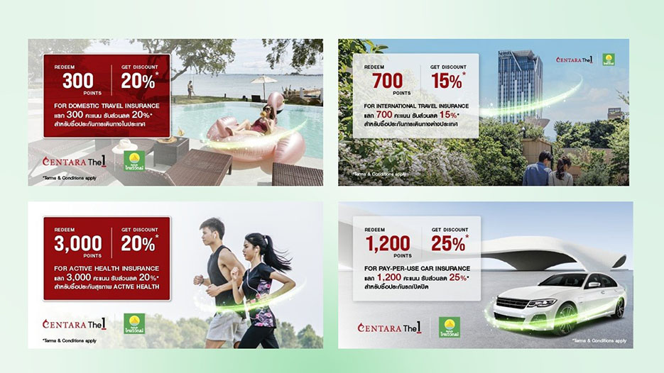 ส่วนลูกค้าและสมาชิก CentaraThe1 สามารถใช้คะแนนสะสม แลกส่วนลดประกันภัยได้ผ่านเว็บไซต์เซ็นทาราตามรายละเอียดดังนี้