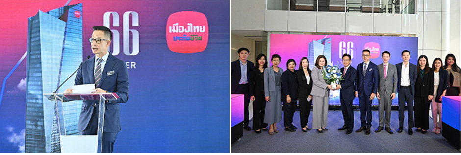 บริษัท เมืองไทยประกันชีวิต จำกัด (มหาชน) จัดงานอย่างยิ่งใหญ่ เปิดตัว 66 Tower” The Living Workplace Solution อาคารออฟฟิศเกรดเอ สูง 28 ชั้น ย่านสุขุมวิท สร้างขึ้นภายใต้แนวคิด “Human Centric Living Workplace” ที่เน้นการออกแบบพื้นที่ให้ความสำคัญกับผู้ใช้งานเป็นศูนย์กลาง พร้อมโดดเด่นด้วยทำเลศักยภาพ และง่ายต่อการเชื่อมต่อเศรษฐกิจชั้นในไปสู่ CBD Area ตอบโจทย์ออฟฟิศสำหรับคนยุคใหม่ โดยในพิธีได้รับเกียรติจาก นายชูฉัตร ประมูลผล เลขาธิการ คณะกรรมการกำกับและส่งเสริมการประกอบธุรกิจประกันภัย (คปภ.) นายโพธิพงษ์ ล่ำซำ ประธานกรรมการ นางยุพา ล่ำซำ  นายกฤษฎา ล่ำซำ รองประธานกรรมการและกรรมการคณะอำนวยการบริหาร นายสาระ ล่ำซำ ประธานเจ้าหน้าที่บริหาร นางสลิล ล่ำซำ นายภูมิชาย ล่ำซำ ที่ปรึกษาประธานเจ้าหน้าที่บริหาร ดร.สุธี โมกขะเวส กรรมการผู้จัดการ  บริษัท เมืองไทยประกันชีวิต จำกัด (มหาชน) พร้อมด้วยนางนวลพรรณ ล่ำซำ ประธานเจ้าหน้าที่บริหาร บริษัท เมืองไทยประกันภัย จำกัด (มหาชน) พ.ต.อ.ดร.ณรัชต์ เศวตนันทน์ นางวรรณพร พรประภา กรรมการผู้จัดการ บริษัท พีแลนด์สเคป จำกัด คณะผู้บริหาร และบริษัทพันธมิตรเข้าร่วมในงาน พิธีจัดขึ้น ณ อาคาร 66 Tower