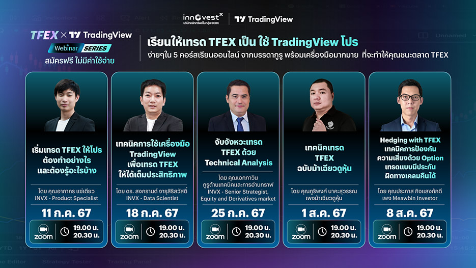 นายพิชัย เลิศสุพงศ์กิจ Chief Commercial Officer บริษัทหลักทรัพย์ อินโนเวสท์ เอกซ์ จำกัด กล่าวว่า “นอกจาก InnovestX จะให้ความสำคัญกับนวัตกรรมผลิตภัณฑ์และบริการด้านการลงทุนที่มีประสิทธิภาพและตอบโจทย์นักลงทุน ทั้งสาย Value Investor (VI) และสาย Technical การเข้าถึงข้อมูลและการส่งเสริมความรู้ด้านการลงทุนก็เป็นเรื่องสำคัญอย่างยิ่งที่ InnovestX ผลักดันอย่างต่อเนื่อง เพื่อให้นักลงทุนสามารถตัดสินใจลงทุนได้อย่างมีประสิทธิภาพ และเพิ่มโอกาสการลงทุนให้ประสบความสำเร็จตามเป้าหมาย โดย InnovestX เป็นบริษัทหลักทรัพย์เจ้าเดียวในประเทศที่นักลงทุนสามารถเทรด TFEX และหุ้นไทยได้ตรงบน TradingView ผ่านบัญชีลงทุน InnovestX ด้วยเหตุนี้ เราจึงเปิดตัว 5 คอร์สเรียนออนไลน์ “เรียนให้เทรด TFEX เป็น ใช้ TradingView โปร” ด้วยเนื้อหาแบบเข้มข้นให้นักลงทุนที่สนใจลงทุนใน TFEX และอยากพัฒนาทักษะสามารถใช้เครื่องมือการลงทุนต่างๆ ของ TradingView ได้อย่างมีประสิทธิภาพ โดยได้รับเกียรติจากกูรูและนักลงทุนผู้เชี่ยวชาญจาก InnovestX อาทิ นายเอกภาวิน สุนทราภิชาติ นักกลยุทธ์อาวุโสตลาดหุ้นและตลาดอนุพันธ์, ดร.สงกรานต์ จารุสิริสวัสดิ์ Data Scientist ตลอดจนนักลงทุนมืออาชีพ อาทิ นายภูริพงศ์ นาคะสุวรรณ เจ้าของเพจม้าเฉียวดูหุ้น The Future, นายประภาส กิจแสงภักดี เจ้าของเพจ Meawbin Investor ร่วมเสริมแกร่งความรู้ พร้อมปูพื้นฐานด้าน TFEX ตั้งแต่เริ่มต้น ครอบคลุมเทคนิคการใช้เครื่องมือ TradingView และ Indicators ต่างๆ ได้อย่างเต็มประสิทธิภาพ ตลอดจนการจับจังหวะ TFEX ด้วย Technical Analysis เพื่อให้นักลงทุนสามารถลงทุนชนะตลาด TFEX และสามารถพัฒนาตนเองให้เป็นเทรดเดอร์มืออาชีพ”