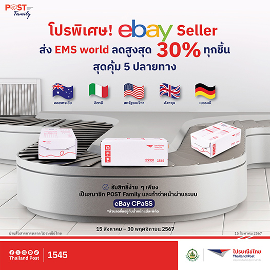 บริษัท ไปรษณีย์ไทย จำกัด จับมือ อีเบย์ (eBay) ร่วมส่งมอบโปรโมชันพิเศษ สำหรับร้านค้าบนแพลตฟอร์มอีเบย์ เพื่อเสริมความแข็งแกร่งให้กับร้านค้าออนไลน์ที่ขยายตลาดไปยังต่างประเทศ ได้สามารถส่งสินค้าถึงมือลูกค้าทั่วโลกได้อย่างสะดวกและคุ้มค่ายิ่งขึ้นเมื่อใช้บริการ EMS World (Merchandise) ส่งด่วน ทั่วโลก โดยมอบส่วนลดสุดคุ้มสูงสุด 30 % สำหรับสินค้าทุกชิ้น ไม่มียอดขั้นต่ำในการส่ง เริ่มแล้วตั้งแต่วันนี้เป็นต้นไปถึงวันที่ 30 พฤศจิกายน 2567 สำหรับผู้ที่สนใจเข้าใช้บริการสามารถเข้าชมรายละเอียดเพิ่มเติมได้ที่ www.international.thailandpost.com