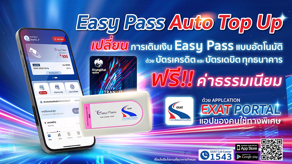 เมื่อวันที่ 6 สิงหาคม 2567 การทางพิเศษแห่งประเทศไทย (กทพ.) กระทรวงคมนาคม ผนึกความร่วมมือกับธนาคารกรุงไทย จำกัด (มหาชน) เพื่อยกระดับการให้บริการ Easy Pass ไปอีกขั้น ด้วยการเติมเงินอัตโนมัติผ่านบัตรเครดิต-เดบิต เมื่อวงเงินคงเหลือต่ำกว่าที่กำหนด ผ่านแอปพลิเคชัน EXAT Portal เพื่ออำนวยความสะดวกผู้ใช้บริการทางพิเศษลดปัญหารถติดหน้าด่าน ฯ จากกรณีเงินในบัตรไม่พอจ่าย ตอบโจทย์วิถีชีวิตยุคดิจิทัลโดยเริ่มให้บริการดังกล่าว ตั้งแต่วันที่ 1 สิงหาคม 2567 ที่ผ่านมา