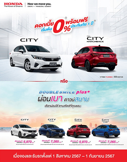 • มาพร้อมข้อเสนอ ดับเบิ้ล สไมล์ พลัส ผ่อนเบา ดาวน์สบาย เลือกผ่อนได้ตามสไตล์ที่คุณชอบ พิเศษสุด! เฉพาะฮอนด้า ซิตี้ เทอร์โบ และ ฮอนด้า ซิตี้ แฮทช์แบ็ก เทอร์โบ ใหม่ เมื่อใช้สินเชื่อดับเบิ้ล สไมล์ พลัส โดยเลือกผ่อนชำระแบบ 5 ปี รับสิทธิพิเศษฮอนด้าช่วยผ่อนเดือนละ 1,200 บาท เป็นเวลา 60 เดือน รวมมูลค่า 72,000 บาท ค่างวดเริ่มต้นเพียง 4,770 บาท (คำนวณจาก ซิตี้ เทอร์โบ เกรด S และ ซิตี้ แฮทช์แบ็ก เทอร์โบ ใหม่ เกรด S+ เงื่อนไขดาวน์ 20% ผ่อน 5 ปี ซึ่งหักค่าผ่อนชำระค่างวดจากแคมเปญฮอนด้าช่วยผ่อนแล้ว) หรือเลือกดาวน์ต่ำเพียง 10% หรือเลือก ดอกเบี้ยพิเศษ 0% พร้อมฟรีประกันภัย 1 ปี