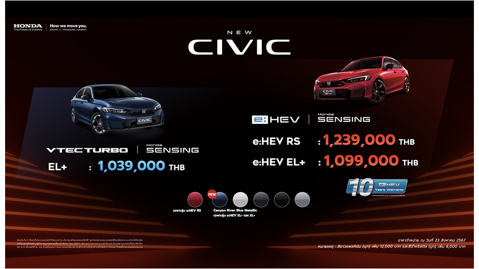 บริษัท ฮอนด้า ออโตโมบิล (ประเทศไทย) จำกัด ประกาศราคาจำหน่ายอย่างเป็นทางการของ ฮอนด้า ซีวิค ใหม่ ไอคอนยนตรกรรมสปอร์ตพรีเมียมซีดานของฮอนด้า ยกระดับความคุ้มค่าด้วยราคาใหม่ ทั้งระบบขับเคลื่อนฟูลไฮบริด e:HEV รุ่น e:HEV EL+ ราคา 1,099,000 และรุ่น e:HEV RS ราคา 1,239,000 บาท และขุมพลังเทอร์โบ รุ่น EL+  ราคา 1,039,000 บาท  พร้อมให้คุณเป็นเจ้าของได้ง่ายยิ่งขึ้น ด้วยข้อเสนอพิเศษ อาทิ ดอกเบี้ยพิเศษเริ่มต้น 0.99%* พร้อมรับ ฮอนด้า เอ็กซ์คลูซีฟ แคร์ ได้แก่ ฟรีประกันภัย 1 ปี ฟรีแพ็กเกจเช็กระยะ ค่าแรง และค่าอะไหล่ตามตารางการบำรุงรักษา 5 ปี หรือ 100,000 กิโลเมตร (อย่างใดอย่างหนึ่งถึงก่อน) ฟรีฮอนด้า อัลติเมท แคร์ ขยายเวลารับประกันคุณภาพรถยนต์ใหม่และบริการช่วยเหลือฉุกเฉินนอกสถานที่ 24 ชั่วโมง อีก 2 ปี หรือ 40,000 กิโลเมตร รวมเป็น 5 ปี หรือ 140,000 กิโลเมตร (อย่างใดอย่างหนึ่งถึงก่อน) พิเศษ เฉพาะรุ่น e:HEV เท่านั้น เสริมความมั่นใจยิ่งขึ้นด้วยการรับประกันอายุการใช้งานแบตเตอรี่ไฮบริดถึง 10 ปี และรับประกันระบบไฮบริดทั้งระบบ 5 ปี ไม่จำกัดระยะทาง
