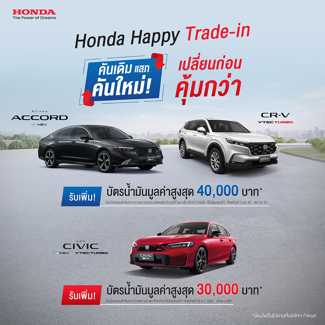 และข้อเสนอพิเศษ “Honda Loyalty*” สำหรับเจ้าของรถยนต์ฮอนด้าและครอบครัวรับดอกเบี้ยพิเศษ ลดลงอีก 0.30% เหลือดอกเบี้ยเริ่มต้นที่ 0.69%* หรือเลือกรับ ดับเบิ้ล สไมล์ พลัส ผ่อนเบา ดาวน์สบาย เลือกผ่อนได้ตามสไตล์ที่คุณชอบ ค่างวดเริ่มต้น 11,221 บาท (คำนวณจาก ซีวิค ใหม่ เกรด EL+ เงื่อนไขดาวน์ 20% ผ่อน 5 ปี) หรือเลือกดาวน์ต่ำเพียง 10% และพิเศษกับแคมเปญ Honda Happy Trade-in” เมื่อนำรถฮอนด้าคันเก่ามาขายและออกรถ ซีวิค ใหม่ ที่โชว์รูมฮอนด้าทั่วประเทศ รับเพิ่ม บัตรน้ำมันมูลค่า 30,000 บาท* หรือเมื่อนำรถยนต์คันเดิมยี่ห้อใดก็ได้มาขายและออกรถ ซีวิค ใหม่ ที่โชว์รูมฮอนด้าทั่วประเทศ รับเพิ่ม บัตรน้ำมันมูลค่า 15,000 บาท* ตั้งแต่วันที่ 23 สิงหาคม 2567 30 พฤศจิกายน 2567*