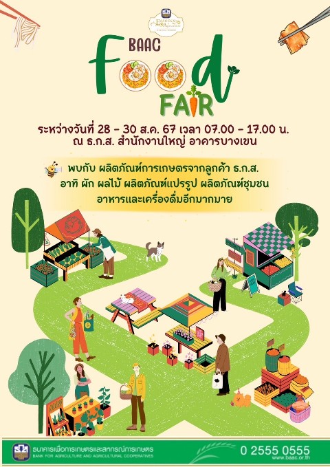 ในโอกาสนี้ ธ.ก.ส. ขอเชิญชวนพี่น้องประชาชนผู้สนใจมา ชม ชิม ช้อป อาหารเครื่องดื่มสินค้าจากเกษตรกรตัวจริงที่มีคุณภาพ ในงาน“BAAC Food Fair” ระหว่างวันที่ 28 -30 สิงหาคมนี้ ตั้งแต่เวลา 07.00 – 17.00 น. ณ บริเวณด้านหน้า ธ.ก.ส. สำนักงานใหญ่ อาคารบางเขน กรุงเทพมหานคร