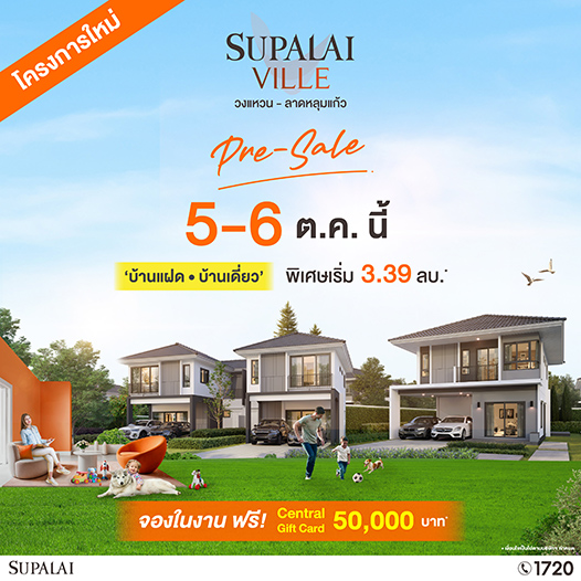 เตรียมพบกับโครงการใหม่ ศุภาลัย วิลล์ วงแหวน-ลาดหลุมแก้ว บ้านเดี่ยว บ้านแฝด 2 ชั้น กับคุณภาพชีวิตที่คุณ ‘สัมผัส’ ได้ ในราคาเริ่มต้น 3.39 ล้านบาท พบกันภายในงาน Pre-Sale ได้แล้ววันที่ 5 – 6 ตุลาคมนี้ ณ สำนักงานขายโครงการศุภาลัย วิลล์ วงแหวน-ลาดหลุมแก้ว เมื่อจองภายในรับฟรี! Central Gift Card มูลค่า 50,000 บาท* (*เงื่อนไขเป็นไปตามที่บริษัทฯ กำหนด) สามารถสอบถามข้อมูลเพิ่มเติมโทร. 1720 หรือติดตามข่าวสารของโครงการได้ที่ www.supalai.com และ Facebook: Supalai
