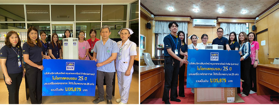 สำหรับการมอบเครื่องฟอกอากาศให้กับโรงพยาบาลดังกล่าว เป็นส่วนหนึ่งของกิจกรรมในโอกาสที่ BAM ครบรอบ 25 ปี จึงได้จัดทำโครงการมอบเครื่องฟอกอากาศให้กับโรงพยาบาล 25 แห่งทั่วประเทศ โดยดำเนินการตามนโยบายส่งเสริมการดำเนินงานด้านสาธารณสุขของประเทศ และร่วมแก้ปัญหามลพิษ เสริมสร้างสุขอนามัยที่ดีให้กับผู้ป่วย รวมทั้งสนับสนุนการปฏิบัติงานบุคลากรทางการแพทย์ให้เกิดประสิทธิภาพในการรักษาพยาบาลผู้ป่วยให้มีสุขภาพที่ดีต่อไป