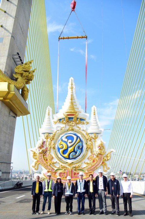 2. ตราสัญลักษณ์ฯ จำนวน 4 ตรา ติดตั้งบริเวณ Upper Crossbeam ของเสา (Pylon) ซึ่งมีความสูงจากระดับผิวถนนบนสะพานทศมราชัน ประมาณ 52 เมตร โดยมีตำแหน่งติดตั้ง 4 ตำแหน่ง คือฝั่งกรุงเทพมหานคร – ขาเข้า ฝั่งกรุงเทพมหานคร-ขาออก ฝั่งธนบุรี – ขาเข้า ปัจจุบันได้ดำเนินการติดตั้งเสร็จเรียบร้อยแล้ว และตำแหน่งสุดท้าย ฝั่งธนบุรี-ขาออก ได้ดำเนินการติดตั้งแล้วเสร็จสมบูรณ์ในวันนี้ (24 ตุลาคม 2567)