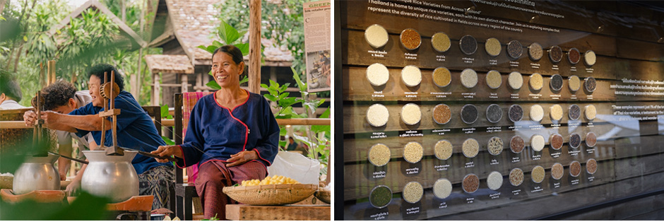 นิทรรศการข้าว Rice is Life: นิทรรศการนี้จะเปิดโลกข้าวที่ทุกคนคิดว่าคุ้นเคย ชวนรู้จักข้าวไทยถึง 50 สายพันธุ์ เรียนรู้วิธีปลูกข้าวแบบดั้งเดิม และที่สำคัญ คือได้ชิมข้าวหลากหลายชนิดใน Rice Tasting Workshop (ทุกวันหยุดสุดสัปดาห์) นอกจากนี้ยังมีโรงสีข้าวโบราณให้ได้เห็นกระบวนการสีข้าวแบบวิถีชาวบ้าน และโชว์ไอเดียการแปรรูปข้าวเป็นผลิตภัณฑ์อื่น ๆ ที่เปี่ยมด้วยความคิดสร้างสรรค์ ชมนิทรรศการเสร็จแล้วก็สามารถเดินลงทุ่งนาไปชมพันธุ์ข้าวหลากสีในธรรมชาติ และอย่าลืมแวะชมปราสาทรวงข้าวสูง 14 เมตร ที่สะท้อนประเพณีอันงดงามของชาวอีสานเพื่อขอบคุณ “ข้าว” สัญลักษณ์แห่งชีวิตและความอุดมสมบูรณ์