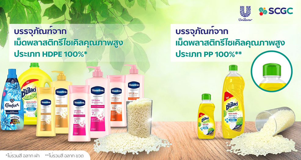 สำหรับความร่วมมือระหว่าง SCGC และกลุ่มบริษัท ยูนิลีเวอร์ ประเทศไทย หรือ Unilever ผู้ผลิตสินค้าอุปโภคบริโภครายใหญ่ระดับโลก เพื่อพัฒนาบรรจุภัณฑ์ที่เป็นมิตรกับสิ่งแวดล้อมยังคงเดินหน้าอย่างเป็นรูปธรรม โดยที่ผ่านมา ได้มีการนำพลาสติกใช้แล้วจากภาคครัวเรือนผลิตเป็นเม็ดพลาสติกรีไซเคิลคุณภาพสูงพอลิเอทิลีนความหนาแน่นสูง (High Quality PCR HDPE Resin) เปลี่ยนเป็นบรรจุภัณฑ์รักษ์โลก ได้แก่ ขวดแกลลอนน้ำยาล้างจานซันไลต์*  ขวดน้ำยาปรับผ้านุ่มคอมฟอร์ท*  และขวดวาสลีน* โดยบรรจุภัณฑ์รีไซเคิลดังกล่าวยังคงคุณสมบัติที่ดีไว้อย่างครบถ้วน ไม่ส่งผลกระทบต่อคุณภาพ กลิ่น หรือเนื้อสัมผัสของผลิตภัณฑ์ นอกจากนี้ยังได้ร่วมกันพัฒนาฝาขวดน้ำยาล้างจานซันไลต์** ซึ่งผลิตจากเม็ดพลาสติกรีไซเคิลคุณภาพสูงพอลิโพรพิลีน (High Quality PCR PP Resin) สะท้อนความเป็นผู้นำในการขับเคลื่อนธุรกิจสู่ความยั่งยืนในระดับสากล