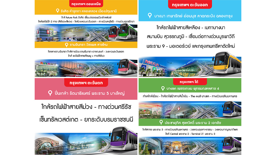 เขียวและสีแดง – ใกล้วงแหวนตะวันออก – ทางด่วนจตุโชติ – ทางด่วนอุดรรัถยา กับโซนรังสิต ลำลูกกา คลองหลวง เมืองปทุมธานี ใกล้ Future Park รังสิต เชื่อมต่อดอนเมืองโทลล์เวย์  และ ใกล้รถไฟฟ้าสายสีชมพูและสายสีเขียว รามอินทราวัชรพล สายไหม ใจกลางรามอินทรา ใกล้ทางด่วน รามอินทรา – อาจณรงค์ – วงแหวนตะวันออกโซนกรุงเทพฯตอนเหนือ ในราคาสุดคุ้มตั้งแต่ 2 -10 ล้านบาท  โซนกรุงเทพฯ ตะวันออก บางนา เทพารักษ์ อ่อนนุช ลาดกระบัง ฉลองกรุง ใกล้รถไฟฟ้าสายสีเหลือง – เมกาบางนา – สนามบินสุวรรณภูมิ – เชื่อมต่อทางด่วนบูรพาวิถี พระราม 9 – มอเตอร์ และกรุงเทพกรีฑาตัดใหม่ ทำเลบางนา เทพารักษ์ อ่อนนุช ลาดกระบัง ฉลองกรุง โซนกรุงเทพฯ ตะวันออก โดยทาวน์โฮม บ้านแนวคิดใหม่ และบ้านเดี่ยว ราคาเริ่มที่ 1.9 – 2.99 ล้านบาท โซนกรุงเทพฯ ตะวันตก ปิ่นเกล้า รัตนาธิเบศร์ พระราม5 บางใหญ่ ใกล้รถไฟฟ้าสายสีม่วง – ทางด่วนศรีรัช – เซ็นทรัลเวสต์เกต – ยกระดับบรมราชชนนี  ในทำเลปิ่นเกล้า รัตนาธิเบศร์ พระราม 5 บางใหญ่ ราคาเริ่มต้น อยู่ที่ 1.89 – 6 ล้านบาท และโซนกรุงเทพฯ ตอนใต้ บางแค เพชรเกษม พุทธมณฑลสาย4 ประชาอุทิศ สุขสวัสดิ์ พระราม2 เอกชัย ทำเลทองใกล้เมือง – ใกล้รถไฟฟ้าสายสีน้ำเงิน – The mall บางแค – ทางด่วนเฉลิมมหานคร พิกัดบางแค เพชรเกษม พุทธมณฑลสาย 4 และ ใกล้สาทร พระราม 3 – ทางด่วนเฉลิมมหานคร – วงแหวนอุตสาหกรรม – วงแหวนกาญจนาภิเษก ใกล้ Central พระราม 2 – Terminal 21 พระราม 3 ทำเลประชาอุทิศ สุขสวัสดิ์ พระราม 2 เอกชัยในโซนกรุงเทพใต้ ราคาเริ่มที่ 1.9 – 6 ล้านบาท