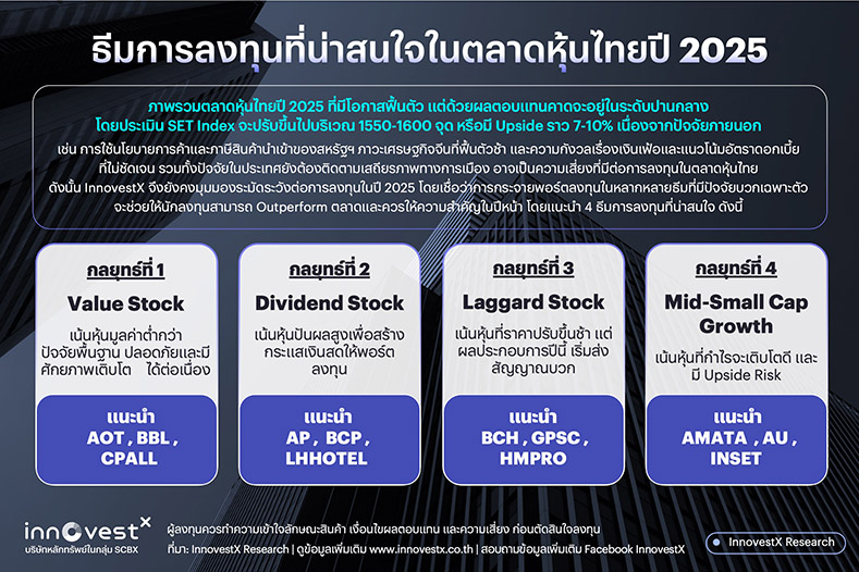 ณะที่ นายสิทธิชัย ดวงรัตนฉายา นักกลยุทธ์อาวุโสตลาดหุ้นไทยและต่างประเทศ บล. อินโนเวสท์ เอกซ์ จำกัด กล่าวทิ้งท้ายว่า “ภาพรวมและกลยุทธ์การลงทุนครึ่งปีแรกมองว่าเศรษฐกิจสหรัฐฯ ยังมีแนวโน้มดีและแข็งแกร่งกว่าภูมิภาคอื่น แนวโน้มดอกเบี้ยยังเป็นการลดลงตามท่าทีของธนาคารกลางสหรัฐฯ รวมไปถึงมาตรการสนับสนุนเศรษฐกิจภายในประเทศของนายโดนัลด์ ทรัมป์ ซึ่งมีการลดค่าใช้จ่ายและลดภาษีเป็นมาตรการสำคัญ แนะนำ กลุ่มการเงินและหุ้นขนาดเล็กและหุ้นที่ได้ประโยชน์ด้านภาษีที่ลดลง ได้แก่ หุ้น HD, V, COST, WMT ในขณะที่เศรษฐกิจไทยมีแนวโน้มฟื้นตัว โดยการท่องเที่ยว การบริโภคและการลงทุนในช่วงครึ่งปีแรก ยังมีแนวโน้มที่ดี เศรษฐกิจโลกอยู่ในสภาวะที่สมดุล นอกจากนั้นมาตรการกระตุ้นเศรษฐกิจภายในประเทศและการลดดอกเบี้ยจะช่วยลดผลจากการชะลอตัวลงของการส่งออกได้ แนะนำ หุ้นขนาดใหญ่ เน้นตั้งรับในกลุ่มที่มีสัดส่วนภายในประเทศสูงในธีม 1) Value ได้แก่ AOT BBL CPALL 2) Dividend ได้แก่ AP BCP LHHOTEL 3) Laggard ได้แก่ BCH GPSC HMPRO และ 4) Mid-Small cap growth ได้แก่ AMATA AU INSET ”สำหรับนักลงทุนที่มองหาโอกาสการลงทุน สามารถติดตามบทวิเคราะห์ และกลยุทธ์การลงทุนจาก InnovestX ที่ครอบคลุมทุกสินทรัพย์ได้ที่ www.innovestx.co.th/cafeinvest และ Facebook: InnovestX