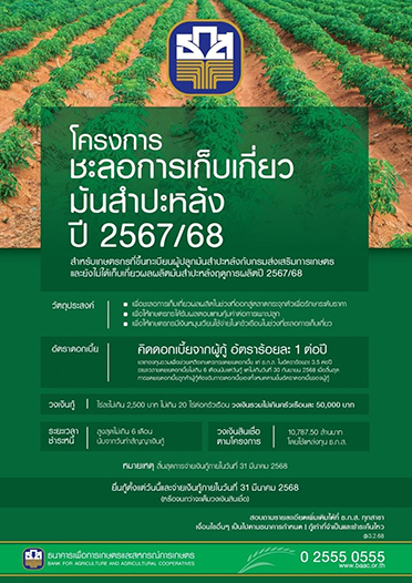 นายฉัตรชัย ศิริไล ผู้จัดการธนาคารเพื่อการเกษตรและสหกรณ์การเกษตร (ธ.ก.ส.) เปิดเผยว่า ที่ประชุมคณะกรรมการ ธ.ก.ส. เมื่อวันที่ 30 มกราคม 2568 ได้มีมติเห็นชอบให้ ธ.ก.ส. ดำเนินโครงการชะลอการเก็บเกี่ยวมันสำปะหลังปี 2567/68 ตามนโยบายรัฐบาล วงเงินสินเชื่อรวม 10,787.50 ล้านบาท เพื่อชะลอการเก็บเกี่ยวผลผลิตมันสำปะหลังเป็นระยะเวลา 6 เดือน ซึ่งถือเป็นช่วงที่ผลผลิตออกสู่ตลาดกระจุกตัว ส่งผลให้ราคามันสำปะหลังลดต่ำลงและไม่คุ้มค่ากับการเพาะปลูก โดยเกษตรกรสามารถนำเงินไปใช้เป็นเงินหมุนเวียนและค่าใช้จ่ายที่จำเป็นในครัวเรือนระหว่างรอการเก็บเกี่ยว ทั้งนี้ ธนาคารจะทำการตรวจสอบพื้นที่เพาะปลูก เพื่อให้สินเชื่อตามมูลค่าพื้นที่ส่วนที่ยังไม่ดำเนินการเก็บเกี่ยว ให้กู้ครัวเรือนละไม่เกิน 2,500 บาทต่อไร่ ไม่เกิน 20 ไร่/ครัวเรือน วงเงินสินเชื่อรวมไม่เกิน 50,000 บาท/ครัวเรือน โดยเกษตรกรชำระอัตราดอกเบี้ยเพียงร้อยละ 1 ต่อปี ส่วนที่เหลือรัฐบาลรับภาระชดเชยดอกเบี้ยแทนเกษตรกรและให้ผ่อนชำระเป็นระยะเวลาไม่เกิน 6 เดือนนับตั้งแต่วันกู้ ทั้งนี้ ไม่เกินวันที่ 30 กันยายน 2568