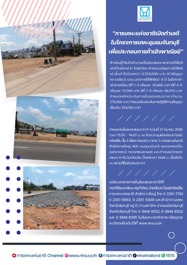 นางนลินี ขำเจริญ รักษาการผู้อำนวยการฝ่ายจัดประโยชน์ทรัพย์สิน กล่าวว่าการเคหะแห่งชาติเปิดทำเลดีให้เอกชนยื่นข้อเสนอราคาการได้สิทธิเช่าที่ดินเพื่อประกอบการค้าเชิงพาณิชย์ในโครงการเคหะชุมชนจันทบุรี บางส่วนของโฉนดเลขที่ 75290 ขนาดเนื้อที่ประมาณ 4-0-56.5 ไร่ เพื่อให้เกิดความโปร่งใสในการดำเนินงานทุกขั้นตอนตามหลักธรรมาภิบาล การเคหะแห่งชาติจึงเปิดโอกาสให้เอกชนที่สนใจสามารถยื่นข้อเสนอราคาการได้สิทธิเช่าที่ดินดังกล่าวโดยมีอัตราค่าธรรมเนียมการได้สิทธิเช่าขั้นต่ำไม่น้อยกว่า 3,100,000 บาท (ทำสัญญาคราวเดียว) ระยะเวลาการให้สิทธิ เช่า 9 ปี ระยะเวลาปลอดค่าเช่า 6 เดือน ในอัตราค่าเช่ารายเดือน ปีที่ 1-3 เดือนละ 70,000 บาท ปีที่ 4-6 เดือนละ 77,000 บาท ปีที่ 7-9 เดือนละ 84,700 บาท กำหนดหลักประกันการยื่นซองเสนอราคาจำนวน 272,000 บาท กำหนดเงินประกัน การปฏิบัติตามสัญญา เป็นเงิน 254,100 บาท