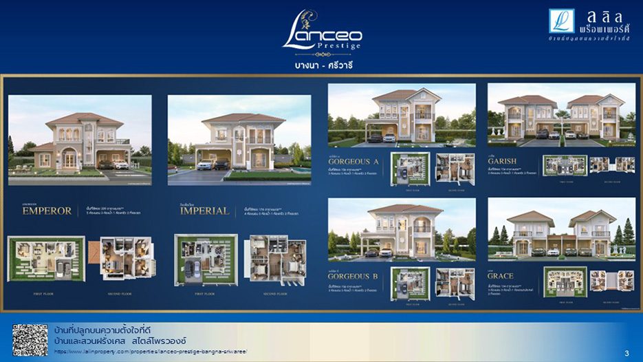 โครงการ “แลนซีโอ เพรสทีจ บางนา-ศรีวารี” ตั้งอยู่บนพื้นที่กว่า 35 ไร่ มีบ้านให้เลือกทั้งแบบบ้านเดี่ยวดีไซน์หรูและบ้านแฝดสไตล์ French Colonial ที่ตอบโจทย์การอยู่อาศัยยุคใหม่ โดยแบบบ้านไฮไลต์คือ “EMPEROR” บ้านขนาดใหญ่ 5 ห้องนอน 3 ห้องน้ำ พื้นที่ใช้สอย 209 ตารางเมตร เหมาะสำหรับครอบครัวขนาดใหญ่หรือครอบครัวที่อยู่ร่วมกันหลายเจเนอเรชัน รองรับไลฟ์สไตล์ที่เน้นการใช้ชีวิตภายในบ้าน ทั้งการทำงาน การเรียน และการพักผ่อน ด้วยแนวคิด Extra Function Room ที่สามารถปรับเปลี่ยนเป็นห้องทำงาน ห้องเรียนออนไลน์ หรือห้องสำหรับผู้สูงอายุได้ตามต้องการ พร้อมแบบบ้านอื่นๆ ให้เลือกหลากหลายดีไซน์ ประกอบด้วย IMPERIAL พื้นที่ใช้สอย 174 ตารางเมตร ขนาด 4 ห้องนอน, GORGEOUS A และ B พื้นที่ใช้สอย 156 ตารางเมตร ขนาด 3 ห้องนอน, GARISH พื้นที่ใช้สอย 154 ตารางเมตร ขนาด 3 ห้องนอน และ GRACE พื้นที่ใช้สอย 134 ตารางเมตร ขนาด 3 ห้องนอน โดยทุกหลังมาพร้อมที่จอดรถ 2 คัน และเน้นการออกแบบภายใต้แนวคิด Green Living Standard Plus ด้วยการเลือกใช้วัสดุประหยัดพลังงาน และติดตั้ง EV Charger ทุกหลัง ราคาเริ่มต้นตั้งแต่ 3.99 – 8 ล้านบาท