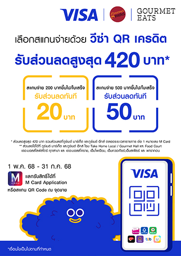 และการขยายบริการแสกนจ่ายด้วย วีซ่า คิวอาร์ เครดิต ครั้งนี้ วีซ่า ยังร่วมมือกับ เดอะมอลล์ กรุ๊ป มอบสิทธิประโยชน์เฉพาะสำหรับผู้ถือบัตร วีซ่าทุกท่าน ได้รับทั้งส่วนลดทันที เมื่อกดรับและใช้ E-Coupon[2] ส่วนลด ผ่านแอปพลิเคชัน M Card มูลค่า 20 บาท หรือ 50 บาท ต่อเดือน พร้อมสแกนจ่ายด้วยวีซ่า คิวอาร์ เครดิต ที่กูร์เมต์ มาร์เก็ต และกูร์เมต์ อีทส์ ในเดอะมอลล์ ไลฟ์สโตร์ ทุกสาขา เดอะมอลล์ โคราช รวมถึง เอ็มโพเรียม เอ็มควอเทียร์ เอ็มสเฟียร์ และพารากอน ตั้งแต่วันนี้ ถึง 31 กรกฎาคม 2568