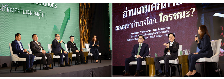 สำหรับหัวข้อถัดมาคือ “Business Adaptation & Solutions” ดร.พจน์ อร่ามวัฒนานนท์ ประธานกรรมการหอการค้าไทยและสภาหอการค้าแห่งประเทศไทย นายอภิชิต ประสพรัตน์ รองประธานสภาอุตสาหกรรมแห่งประเทศไทย และนายเรืองโรจน์ พูนผล ประธานกลุ่มบริษัท กสิกร บิซิเนส-เทคโนโลยี กรุ๊ป (KBTG) เห็นพ้องกันว่าไทยเผชิญความท้าทายจากการปรับตัวช้าในสถานการณ์ที่คาดเดาได้ยาก และเพื่อให้ธุรกิจอยู่รอดต้องปรับตัวด้วยการหาตลาดใหม่และกระจายความเสี่ยง เร่งผลักดันและพัฒนาศักยภาพในการแข่งขันด้วยการนำเทคโนโลยีและ AI มาใช้ เพื่อลดต้นทุน เพิ่ม Productivity นำสินค้าเดิมมาพัฒนารูปแบบใหม่ เพื่อสร้างมูลค่าเพิ่มและจับกลุ่มลูกค้าใหม่ รวมถึงเพิ่มมุมมองการรับรู้เรื่อง ESG ที่เป็นโอกาสทำให้ธุรกิจเติบโตอย่างยั่งยืน