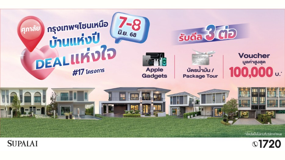 บริษัท ศุภาลัย จำกัด (มหาชน) เตรียมจัดงานมอบแคมเปญใหม่ “บ้านแห่งปี ดีลแห่งใจ” ในวันที่ 7-8 มิถุนายนนี้ เพื่อตอบสนองความต้องการของตลาดที่อยู่อาศัยแนวราบกรุงเทพฯ โซนเหนือ ที่ยังคงเติบโตอย่างต่อเนื่อง กับ 17 โครงการคุณภาพครอบคลุมบ้านเดี่ยว บ้านแฝด และทาวน์โฮม ในราคาเริ่มต้น 1.89 ล้านบาท ถึง 30 ล้านบาท* พร้อมดีลพิเศษลุ้นรับของแถม 3 ต่อ รวมมูลค่าสูงสุด 440,000 บาท*