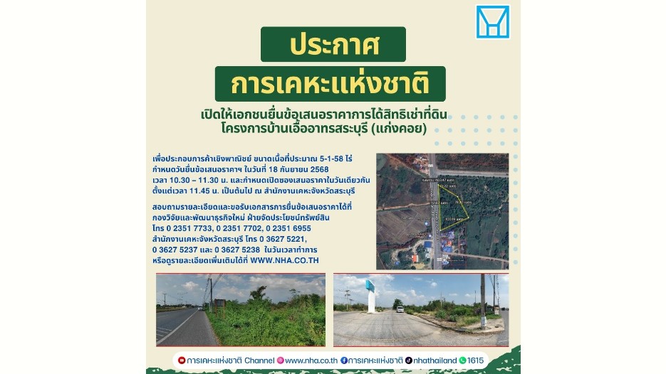 นายอรรคพล ภิรมย์ประดิษฐ์ ผู้อำนวยการฝ่ายจัดประโยชน์ทรัพย์สิน กล่าวว่า การเคหะแห่งชาติเปิดให้เอกชนยื่นข้อเสนอราคาการได้สิทธิเช่าที่ดิน เพื่อประกอบการค้าเชิงพาณิชย์ภายในโครงการเอื้ออาทรสระบุรี (แก่งคอย) ของโฉนดเลขที่ 21832 ขนาดเนื้อที่ประมาณ 5-1-58 ไร่ เพื่อให้เกิดความโปร่งใสในการดำเนินงานทุกขั้นตอนตามหลักธรรมาภิบาล การเคหะแห่งชาติจึงเปิดโอกาสให้เอกชนที่สนใจสามารถยื่นข้อเสนอราคาการได้สิทธิเช่าที่ดินดังกล่าว