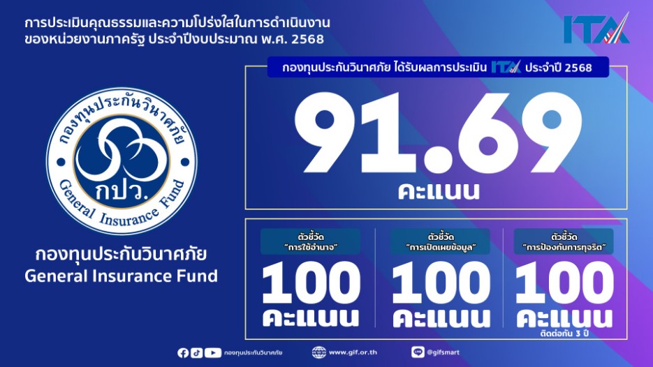 นายชนะพล มหาวงษ์ ผู้จัดการกองทุนประกันวินาศภัย เผยว่า ในปีงบประมาณ 2568 มีหน่วยงานภาครัฐประเภทกองทุนเข้าร่วมการประเมิน ITA ทั้งสิ้น 12 หน่วยงาน จากจำนวนหน่วยงานภาครัฐทั่วประเทศ 8,327 แห่ง โดยผลการประเมินภาพรวมทั้งประเทศอยู่ที่ 93.82 คะแนน ซึ่งแม้ว่าคะแนนของ กปว. จะต่ำกว่าค่าเฉลี่ยเล็กน้อย แต่การได้คะแนนเต็มในหมวดสำคัญถึง 3 ตัวชี้วัดถือเป็นสิ่งที่น่าภาคภูมิใจและเป็นหลักฐานชัดเจนว่าองค์กรดำเนินงานด้วยความซื่อสัตย์สุจริต โปร่งใส รวมถึงมีระบบตรวจสอบที่เข้มแข็ง และองค์กรจะยังคงยึดผลการประเมิน ITA เป็นแนวทางขับเคลื่อนการดำเนินงานในอนาคต โดยมุ่งพัฒนาระบบงานด้วยหลักธรรมาภิบาล เสริมสร้างความโปร่งใสในทุกขั้นตอนการปฏิบัติ และขณะเดียวกันก็ให้ความสำคัญกับการบริการประชาชน โดยนำเทคโนโลยีดิจิทัลมาเป็นเครื่องมือช่วยเพิ่มประสิทธิภาพ เพื่อให้การให้บริการเป็นไปอย่างรวดเร็ว ถูกต้อง และตอบโจทย์ความต้องการของผู้มีส่วนได้ส่วนเสีย