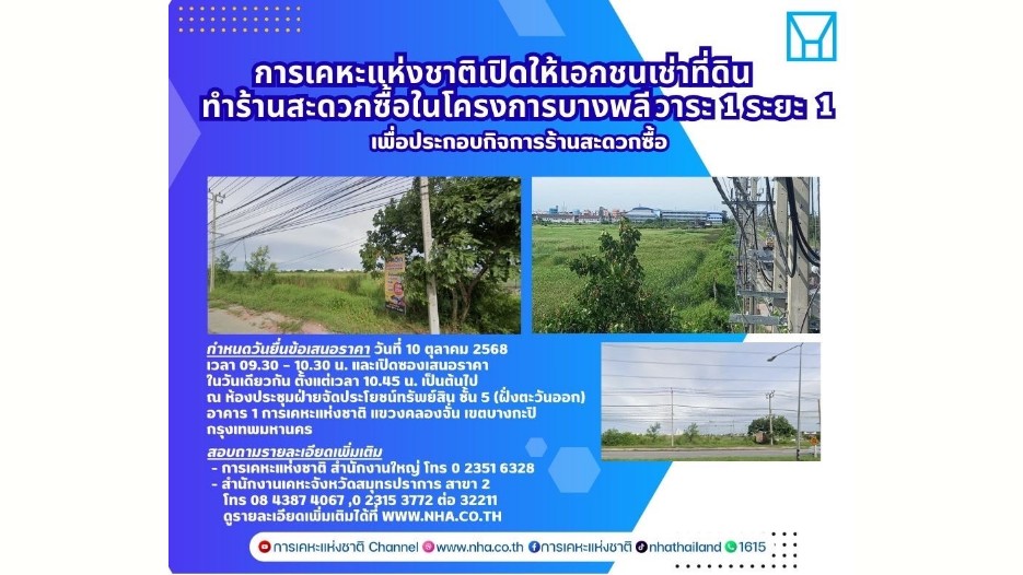 นายอรรคพล ภิรมย์ประดิษฐ์ ผู้อำนวยการฝ่ายจัดประโยชน์ทรัพย์สิน กล่าวว่า การเคหะแห่งชาติเปิดให้เอกชนยื่นข้อเสนอราคาการได้สิทธิเช่าที่ดิน เพื่อประกอบกิจการร้านสะดวกซื้อ พร้อมกิจกรรมต่อเนื่อง ภายในโครงการบางพลี วาระ 1 ระยะ 1 ของโฉนดเลขที่ 31568 ขนาดเนื้อที่ประมาณ 1-0-0 ไร่ เพื่อให้เกิดความโปร่งใสในการดำเนินงานทุกขั้นตอนตามหลักธรรมาภิบาล การเคหะแห่งชาติจึงเปิดโอกาสให้เอกชนที่สนใจสามารถยื่นข้อเสนอราคาการได้สิทธิเช่าที่ดินดังกล่าว โดยมีอัตราค่าธรรมเนียมการได้สิทธิเช่าขั้นต่ำไม่น้อยกว่า 802,000 บาท ระยะเวลาการให้สิทธิเช่า 6 ปี (ทำสัญญาคราวเดียว) ในอัตราค่าเช่ารายเดือน ปีที่ 1-3 เดือนละ 84,600 บาท ปีที่ 4-6 เดือนละ 92,200 บาท กำหนดหลักประกันการยื่นซองเสนอราคาจำนวน 160,000 บาท กำหนดเงินประกันการปฏิบัติตามสัญญา จำนวน 3 เท่าของค่าเช่ารายเดือนปีสุดท้าย เป็นเงิน 276,600 บาท