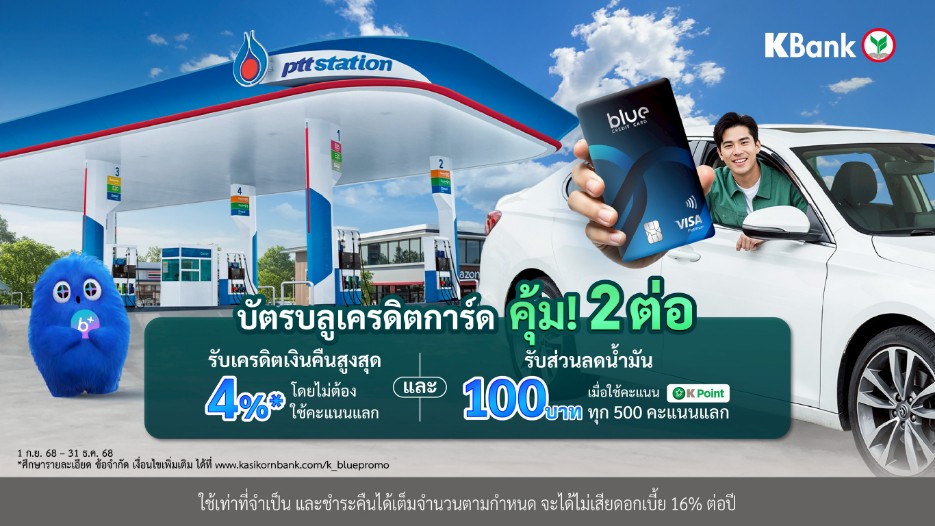 “บัตรบลูเครดิตการ์ด (Blue Credit Card)” บัตรเครดิตร่วมระหว่างธนาคารกสิกรไทย กับ บริษัท ปตท. น้ำมันและการค้าปลีก จำกัด (มหาชน) หรือ OR เพิ่มความคุ้มค่า 2 ต่อ เมื่อเติมน้ำมัน ณ สถานีบริการ พีทีที สเตชัน และจ่ายด้วยบัตรบลูเครดิตการ์ด