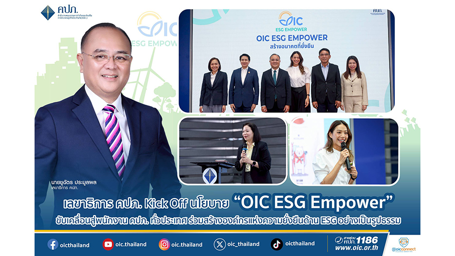 เลขาธิการ คปภ. กล่าวว่า สำนักงาน คปภ. ในฐานะหน่วยงานกำกับดูแลภาคธุรกิจประกันภัยของประเทศ มีบทบาทสำคัญในการขับเคลื่อนเศรษฐกิจและสังคมไทยให้เติบโตอย่างมั่นคงและยั่งยืน การนำหลัก ESG มาบูรณาการในทุกกระบวนการทำงาน จึงไม่ใช่เพียงนโยบาย แต่คือ “แนวทางการบริหารจัดการที่ต้องลงมือทำจริง” ทั้งในระดับนโยบายและระดับปฏิบัติ เพื่อให้ทุกการตัดสินใจ ทุกโครงการ และทุกนโยบายของ คปภ. สะท้อนถึงความยั่งยืนอย่างแท้จริง โดยกำหนดนโยบาย OIC ESG Empower ใน 3 มิติ ได้แก่มิติ E Environment (สิ่งแวดล้อม) ลดการใช้กระดาษและพลังงานในสำนักงาน ส่งเสริมการใช้พลังงานสะอาด และบริหารจัดการของเสียอย่างยั่งยืน มิติ S Social (สังคม) ให้ความสำคัญกับการพัฒนาบุคลากรอย่างเท่าเทียม สร้างกิจกรรมเพื่อชุมชน และส่งเสริมวัฒนธรรมองค์กรแห่งความร่วมมือ และมิติ G Governance (ธรรมาภิบาล) ยึดหลักการตัดสินใจที่โปร่งใส ตรวจสอบได้ ไม่มีผลประโยชน์ทับซ้อน และดำเนินงานด้วยความถูกต้องตามหลักจริยธรรม