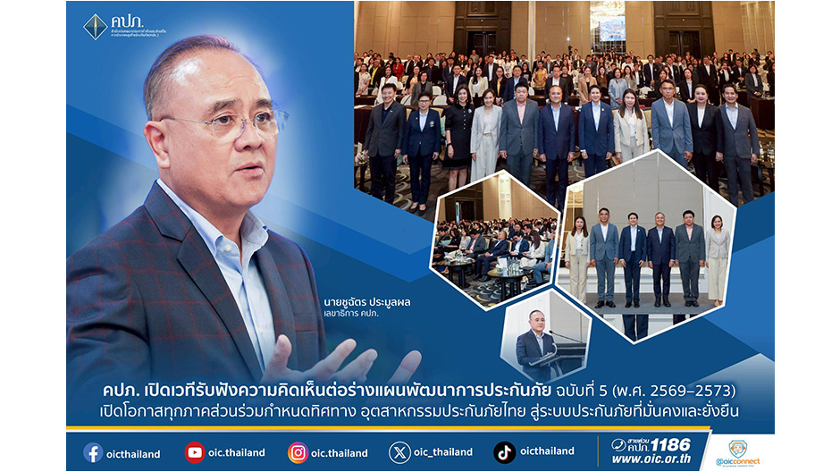 สำนักงานคณะกรรมการกำกับและส่งเสริมการประกอบธุรกิจประกันภัย (สำนักงาน คปภ.) จัดการประชุมรับฟังความคิดเห็น (Public Hearing) ต่อร่างแผนพัฒนาการประกันภัย ฉบับที่ 5 (พ.ศ. 2569–2573) เพื่อเปิดโอกาสให้ทุกภาคส่วนในอุตสาหกรรมประกันภัยได้มีส่วนร่วมในการกำหนดทิศทางอนาคตของอุตสาหกรรมประกันภัยไทยไปด้วยกัน โดยมีนายชูฉัตร ประมูลผล เลขาธิการ คปภ. เป็นประธานเปิดการประชุม เมื่อวันที่ 22 กันยายน 2568 ณ ห้องวิภาวดี บอลรูม โรงแรมเซ็นทารา แกรนด์ เซ็นทรัลพลาซา ลาดพร้าว กรุงเทพฯ