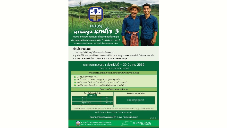 ธนาคารเพื่อการเกษตรและสหกรณ์การเกษตร (ธ.ก.ส.) จัดแคมเปญแทนคุณ แทนใจ 3 สำหรับลูกค้าที่ใช้บริการสินเชื่อแทนคุณ ที่เปิดโอกาสให้ทายาทเข้ามามีส่วนร่วมในการแก้ไขหนี้สินครัวเรือนให้กับเกษตรกรลูกค้าที่อายุตั้งแต่ 60 ปีขึ้นไป ที่พร้อมโอนทรัพย์สินหลักประกันให้กับทายาท เพื่อรักษาทรัพย์สินให้คงอยู่กับครอบครัว โดย ธ.ก.ส. จะจ่ายสินเชื่อให้ทายาทที่มารับช่วงในการประกอบอาชีพในอัตราพิเศษ พร้อมมอบสิทธิพิเศษเมื่อสินเชื่อได้รับการอนุมัติ รับทันที ความคุ้มครองชีวิตผ่านกรมธรรม์เงินฝากสงเคราะห์ชีวิต ธกส รักคุณ แบบ 2 (มูลค่า 399 บาท) พร้อมให้ความคุ้มครองสูงสุด 100,000 บาท เพียงสแกน QR Code ลงทะเบียนรับสิทธิ์ ณ สาขาที่ขอสินเชื่อ (จำกัด 800 สิทธิ์ ตลอดระยะแคมเปญ) ลงทะเบียนได้เลยตั้งแต่บัดนี้จนถึง 20 มีนาคม 2569