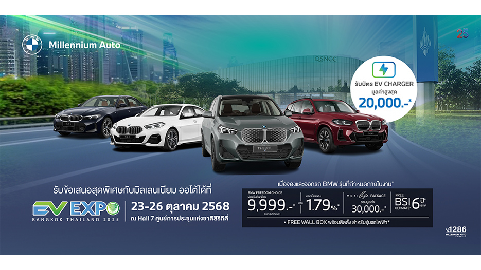 บริษัท มิลเลนเนียม ออโต้ กรุ๊ป จำกัด ผู้จำหน่ายรถยนต์ บีเอ็มดับเบิลยู, มินิ และ มอเตอร์ไซค์ บีเอ็มดับเบิลยู มอเตอร์ราด อย่างเป็นทางการในประเทศไทย ภายใต้บริษัท มิลเลนเนียม กรุ๊ป คอร์ปอเรชั่น (เอเชีย) จำกัด (มหาชน) หรือ MGC-ASIA จัดแสดงยนตรกรรม BMW ที่ขับเคลื่อนด้วยไฟฟ้าหลากรุ่น พร้อมจำหน่ายภายใต้ข้อเสนอสุดพิเศษที่งาน ‘BANGKOK EV EXPO 2025’ ระหว่างวันที่ 23-26 ตุลาคม 2568 ณ ฮอลล์ 7 ศูนย์การประชุมแห่งชาติสิริกิติ์ หรือรับข้อเสนอสุดคุ้มค่าได้ที่โชว์รูม บีเอ็มดับเบิลยู มิลเลนเนียม ออโต้ ทุกสาขาทั่วประเทศ