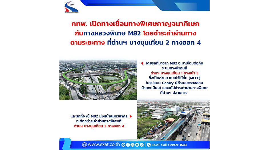 การทางพิเศษแห่งประเทศไทย (กทพ.) กระทรวงคมนาคม เปิดใช้งานด่านเก็บค่าผ่านทางพิเศษบางขุนเทียน 1 ทางเข้า 3 (ขาเข้า) และด่านเก็บค่าผ่านทางพิเศษบางขุนเทียน 2 ทางออก 4 (ขาออก) โดยคิดค่าผ่านทางตามระยะทาง เพื่อเชื่อมทางหลวงพิเศษระหว่างเมืองหมายเลข 82 สายทางยกระดับบางขุนเทียน – บ้านแพ้ว (M82) ซึ่งกรมทางหลวงได้ดำเนินการก่อสร้างทางยกระดับบางขุนเทียน – เอกชัย (ตอนที่ 1) และมีทางเชื่อมต่อกับทางพิเศษกาญจนาภิเษก (บางพลี-สุขสวัสดิ์) โดยใช้ระบบตรวจสอบป้ายทะเบียน ALPR ขาเข้าร่วมกับเสาอากาศ (ANTENNA) โดยไม่มีไม้กั้น ซึ่งเป็นจุดเช็ค Point สำหรับรถที่มาจากทางเชื่อม M82 เข้าทางพิเศษกาญจนาภิเษกโดยใช้ AI และกล้อง: ระบบใช้เทคโนโลยีปัญญาประดิษฐ์ (AI) และกล้องเพื่อตรวจจับและบันทึกภาพป้ายทะเบียนรถ ร่วมกับอ่านบัตรรับชำระค่าผ่านทางแบบ electronic (Easy Pass และ M-pass) เพื่อให้ผู้ใช้ทางชำระค่าผ่านทางที่ด่านฯ ทางออกปลายทาง ซึ่งได้เปิดทดลองให้บริการตั้งแต่วันที่ 22 ตุลาคม 2568