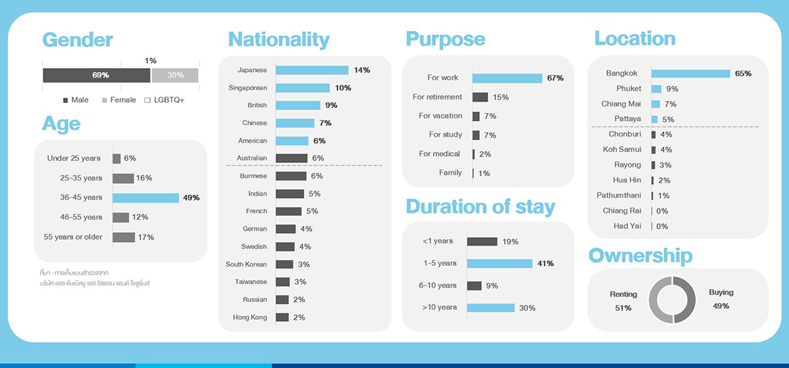 จากผลการสำรวจพบว่า กลุ่มชาวต่างชาติที่เข้ามาอยู่ในประเทศไทย 5 ประเทศแรกที่ตอบแบบสอบถามเป็นญี่ปุ่น สิงค์โปร์ อังกฤษ จีน และสหรัฐอเมริกา คิดเป็นสัดส่วน 46% ของจำนวนผู้ตอบแบบสอบถามทั้งหมด ที่เหลือได้แก่ ออสเตรเลีย พม่า ฝรั่งเศส อินเดีย เยอรมณี สวีเดน เกาหลีใต้ ไต้หวัน รัสเซีย และฮ่องกง เป็นกลุ่มคนที่มีอายุระหว่าง 36 ถึง 45 ปี คิดเป็นสัดส่วน 49% ของจำนวนผู้ตอบแบบสอบถามทั้งหมด ถัดมาจะมีอายุระหว่าง 55 ปีขึ้นไป คิดเป็นสัดส่วน 17% และ อายุระหว่าง 25-35 ปี คิดเป็นสัดส่วน 16% ของจำนวนผู้ตอบแบบสอบถามทั้งหมด