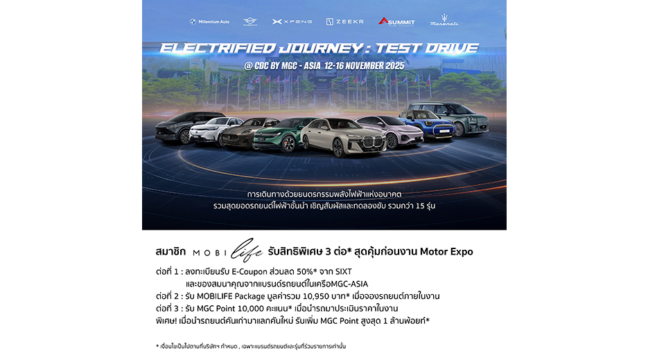 มิลเลนเนียม กรุ๊ป คอร์ปอเรชั่น (เอเชีย) หรือ MGC-ASIA ตอกย้ำผู้นำธุรกิจไลฟ์สไตล์โมบิลิตี้ครบวงจร จัดงาน “Electrified Journey by MGC-ASIA” รวมสุดยอดยนตรกรรมพลังไฟฟ้า 7 แบรนด์ชั้นนำกว่า 15 รุ่น ให้ทดลองขับและสัมผัสเทคโนโลยีล้ำสมัย พร้อมข้อเสนอสุดพิเศษ ระหว่างวันที่ 12–16 พฤศจิกายน 2568 ณ คริสตัล ดีไซน์ เซ็นเตอร์ (CDC) เลียบทางด่วนเอกมัย–รามอินทรา