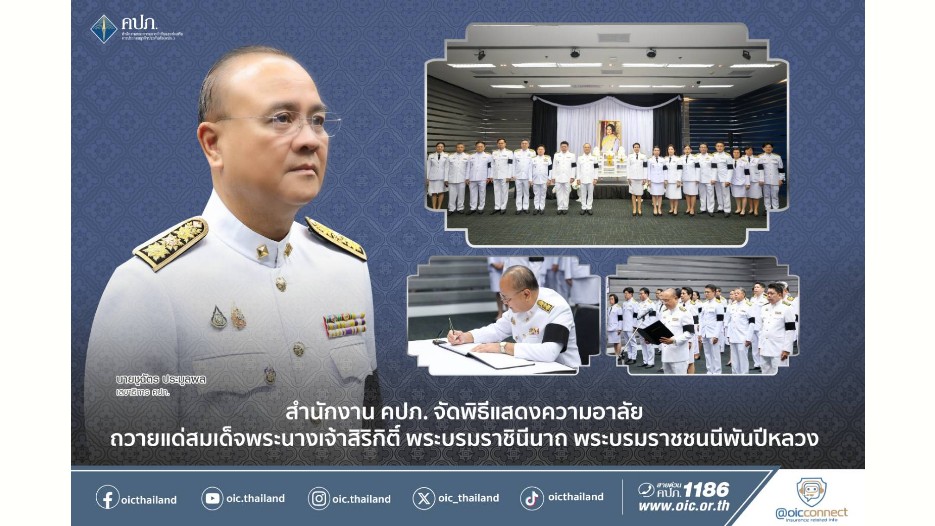นายชูฉัตร ประมูลผล เลขาธิการ คณะกรรมการกำกับและส่งเสริมการประกอบธุรกิจประกันภัย (เลขาธิการ คปภ.) นำคณะผู้บริหาร และพนักงาน ร่วมพิธีแสดงความอาลัย ถวายแด่สมเด็จพระนางเจ้าสิริกิติ์ พระบรมราชินีนาถ พระบรมราชชนนี พันปีหลวง พร้อมยืนสงบนิ่งเป็นเวลา 93 วินาที และลงนามถวายความอาลัยเบื้องหน้าพระบรมฉายาลักษณ์ สมเด็จพระบรมราชินีนาถ พระบรมราชชนนีพันปีหลวง เพื่อแสดงความจงรักภักดีและน้อมสำนึกในพระมหากรุณาธิคุณอันหาที่สุดมิได้ ณ สำนักงาน คปภ. ถนนรัชดาภิเษก กรุงเทพมหานคร เมื่อวันที่ 3 พฤศจิกายน 2568