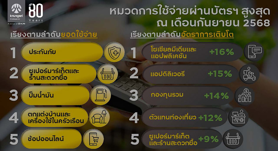 ข้อมูลเชิงลึกจากกรุงศรี คอนซูมเมอร์ สะท้อนการเปลี่ยนแปลงพฤติกรรมอย่างมีนัยสำคัญ โดยหมวดที่มียอดใช้จ่ายผ่านบัตรสูงสุด 5 อันดับแรกได้แก่ 1.ประกันภัย 2.ซูเปอร์มาร์เก็ตและร้านสะดวกซื้อ 3.ปั๊มน้ำมัน 4.ตกแต่งบ้านและเครื่องใช้ในครัวเรือน 5.ช้อปออนไลน์
