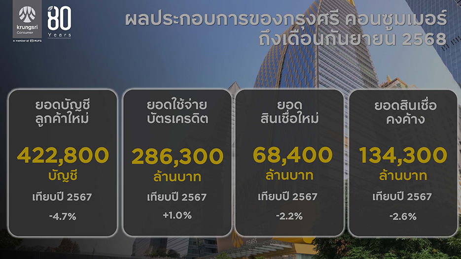 ภายใต้ทิศทาง “โตอย่างมีคุณภาพ” กรุงศรี คอนซูมเมอร์ ตั้งเป้าสิ้นปี 2568 จะมียอดใช้จ่ายผ่านบัตรรวม 400,000 ล้านบาท ยอดสินเชื่อใหม่ 94,000 ล้านบาท และสินเชื่อคงค้าง 143,000 ล้านบาท พร้อมคาดหวังเห็นสัญญาณฟื้นตัวต่อเนื่องในช่วงต้นปี 2569