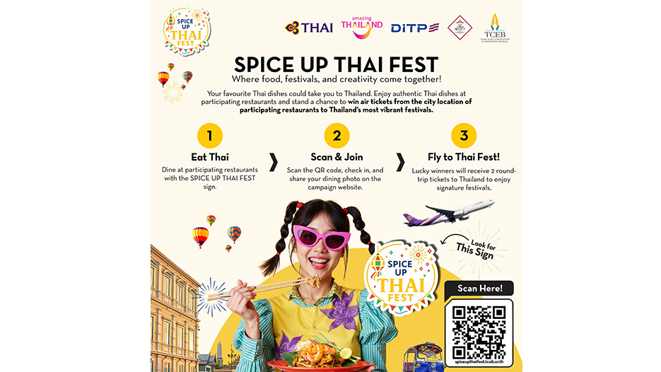 สำหรับแคมเปญ Spice Up Thai Fest ลูกค้าเพียงรับประทานอาหารที่ร้านอาหารไทยในต่างประเทศที่เข้าร่วมโครงการ พร้อมสแกน QR Code ณ ร้านอาหารที่เข้าร่วม เพื่อเข้าสู่แพลตฟอร์มออนไลน์ www.SpiceUpThaiFest.tceb.or.th และร่วมกิจกรรมโดยถ่ายภาพพร้อมบรรยายความรู้สึกกับอาหารไทยและอัตลักษณ์ความเป็นไทย และเช็คอินบนแพลตฟอร์ม ก็มีโอกาสได้รับตั๋วเครื่องบินไป-กลับจากสายการบินไทย รวมกว่า 55 รางวัล เพื่อมาร่วมสัมผัสประสบการณ์งานเฟสติวัลไทยในประเทศไทย โดยสามารถร่วมกิจกรรมได้ตั้งแต่วันที่ 15 พฤศจิกายน 2568 – 18 มกราคม 2569 พร้อมประกาศผู้ได้รับรางวัลบนแพลตฟอร์มในวันที่ 22 มกราคม 2569 สามารถติดตามรายละเอียดแคมเปญได้ที่ www.SpiceUpThaiFest.tceb.or.th